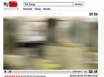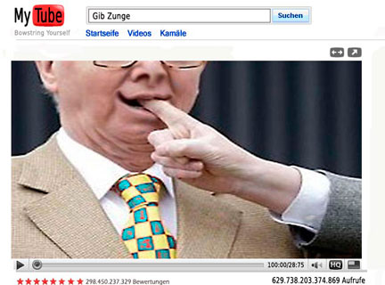 Dann der nächste Knall: Mit der Erfindung des Videoformats mytube generierte ich die Möglichkeit weltweiter Verschweinung und Entgeistigung und warf somit die Schatten des Web 2 in die nahe Zukunft. Ein Geniestreich. In der Folge parasitärten amerikanische Campushirsche meine Idee und oktroyierten dem follends ferblödenden Fun- und Fusselfolk angeschimmelte Billigderivate als da sind myface, spacebook, twitterVZ, blogcastings, pods, chatrooms und wie das entgleisende Communitygeblubber noch alles blähmäulig lob- und wichtiggehudelt wird.